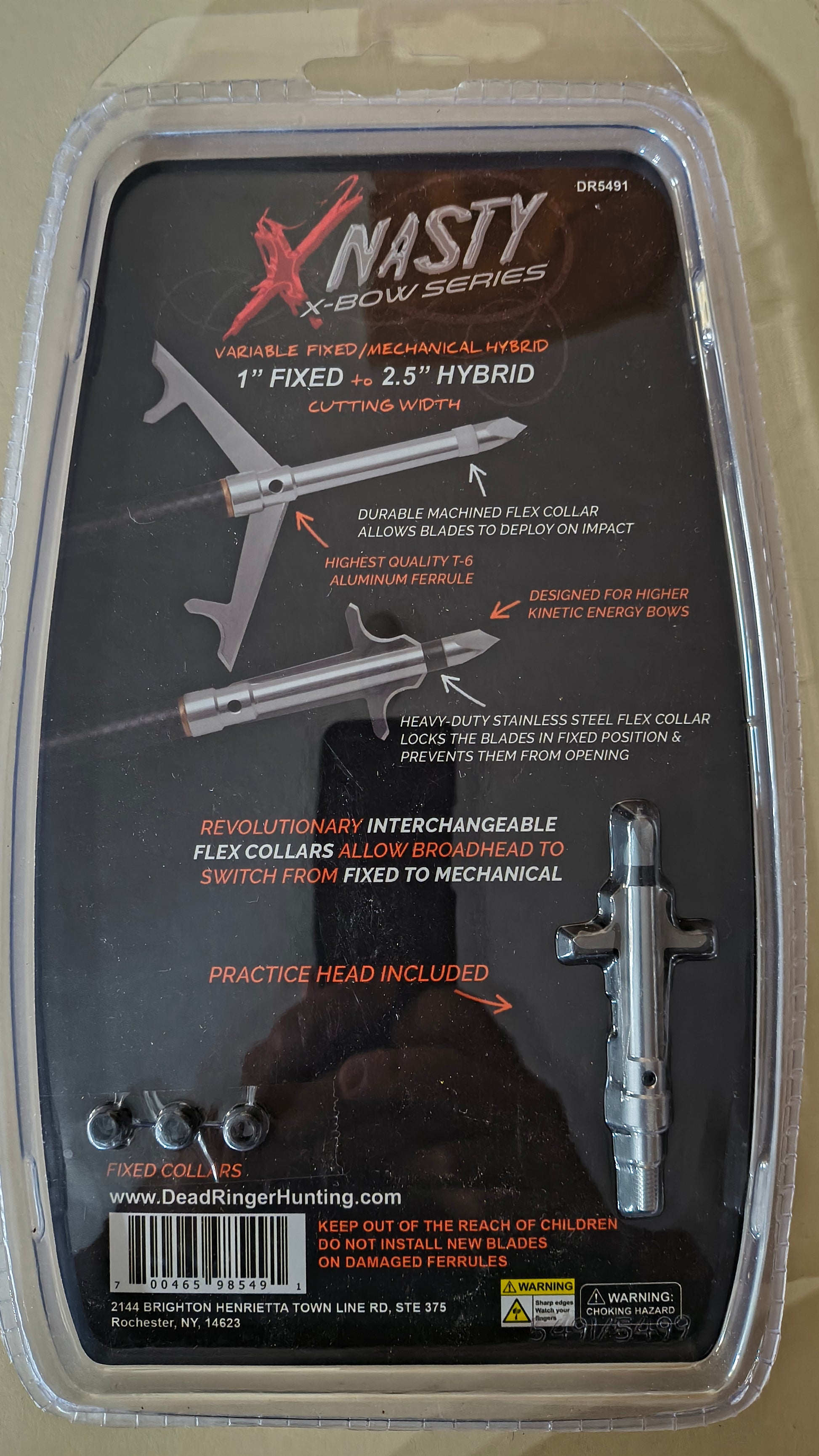 Devastation beyond belief - massive 2-1/2" cutting widths. Specifically designed for higher kinetic energy bows. If you want supreme stopping power, use the X Nasty to wreak havoc and leave massive blood trails on your next hunt. These top quality broadheads are designed to deploy on impact and engineered to work flawlessly every time - even on heavily angled shots. Patented SBT Blade retention system allows the broadhead to stitch from fixed to mechanical.