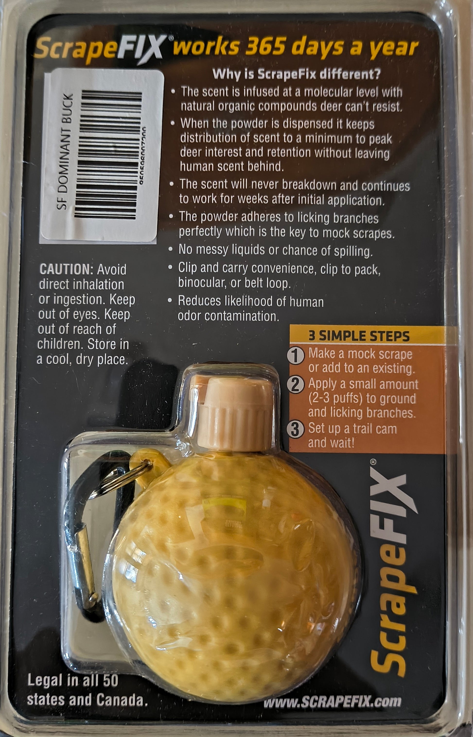 100% Synthetic powder based Dominant Buck can be used all year long, scrapes are used year-round by whitetails as a means of communication. Use ScrapeFix as an effective and simple way to inventory your deer without having to use bait and or minerals.